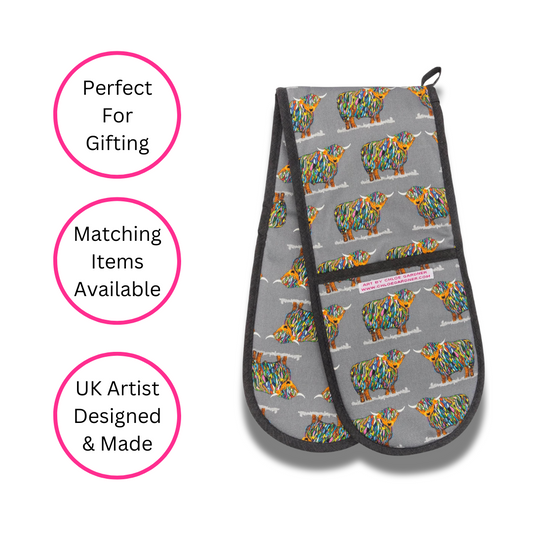 Repeat Bright Highland Cow Double Oven Glove On Grey
