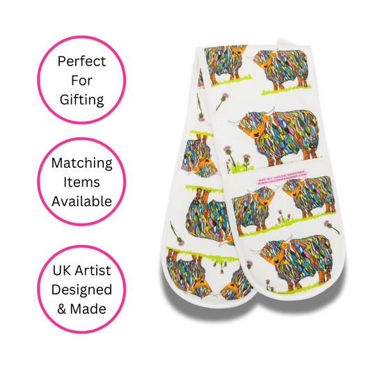 Repeat Bright Highland Cow Double Oven Glove On White