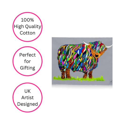Bright Highland Cow Tea Towel On Grey